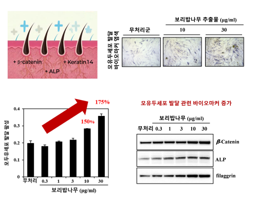 이번 연구에서 보고된 보리밥나무 추출물은 세포 실험(in vitro) 환경에서 모유두세포 활성도를 농도 의존적으로 높여 주었습니다. 10㎍/mL 처리 시 약 150%, 30㎍/mL 처리 시 약 175%까지 활성이 증가했다는 데이터는,